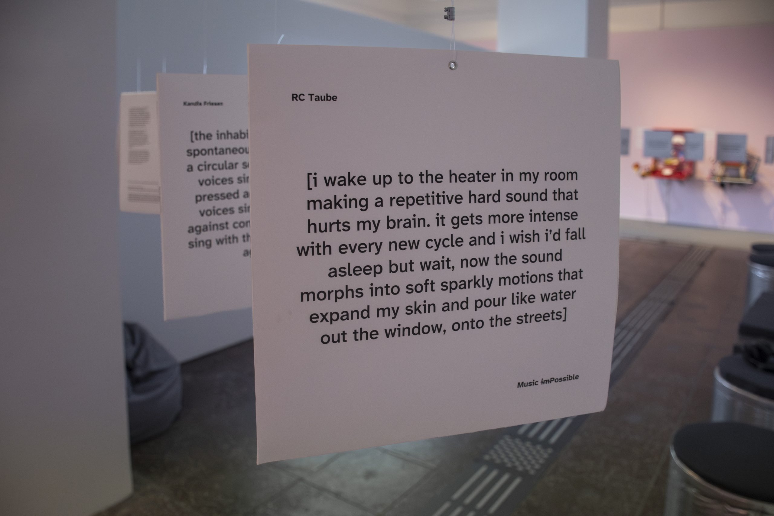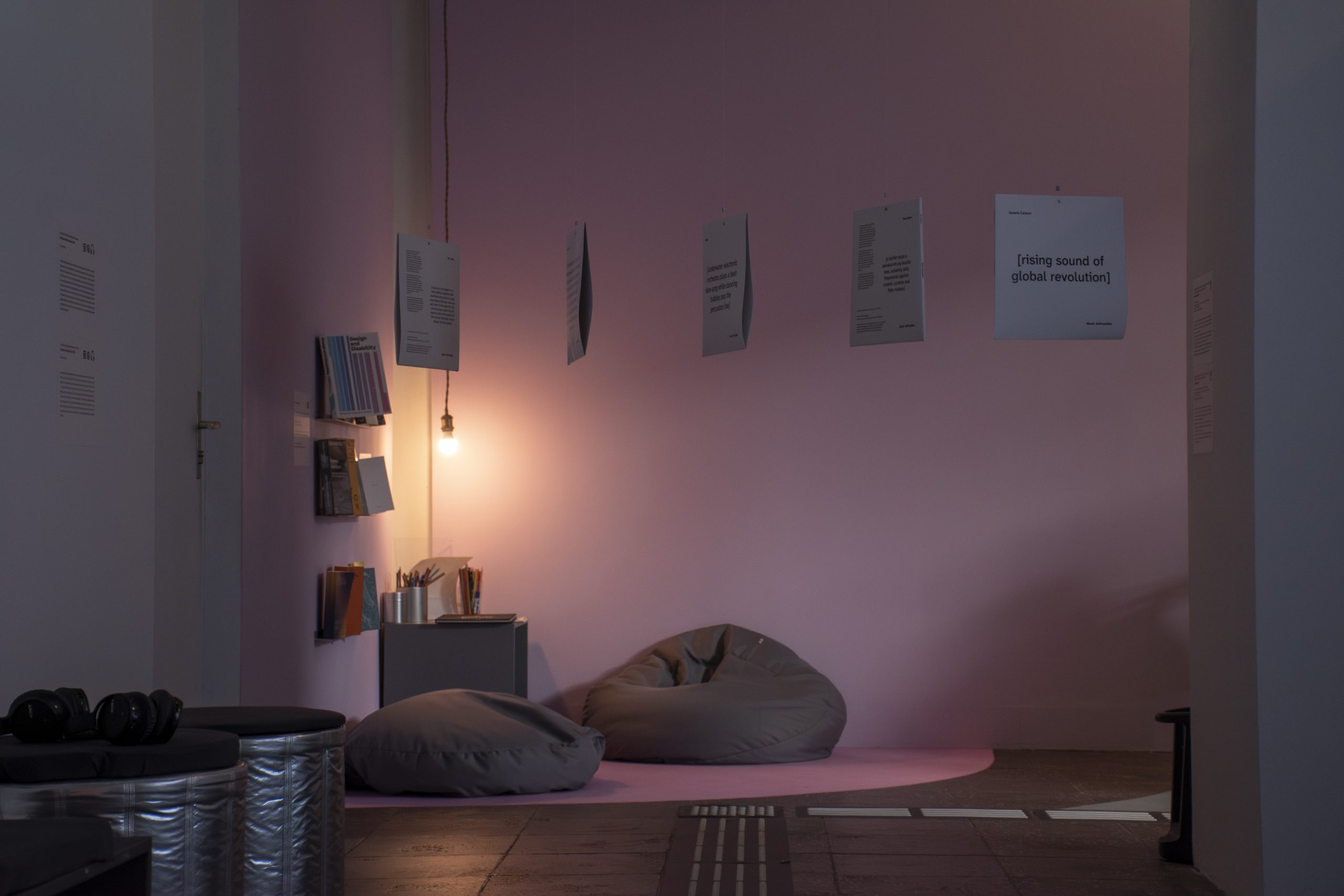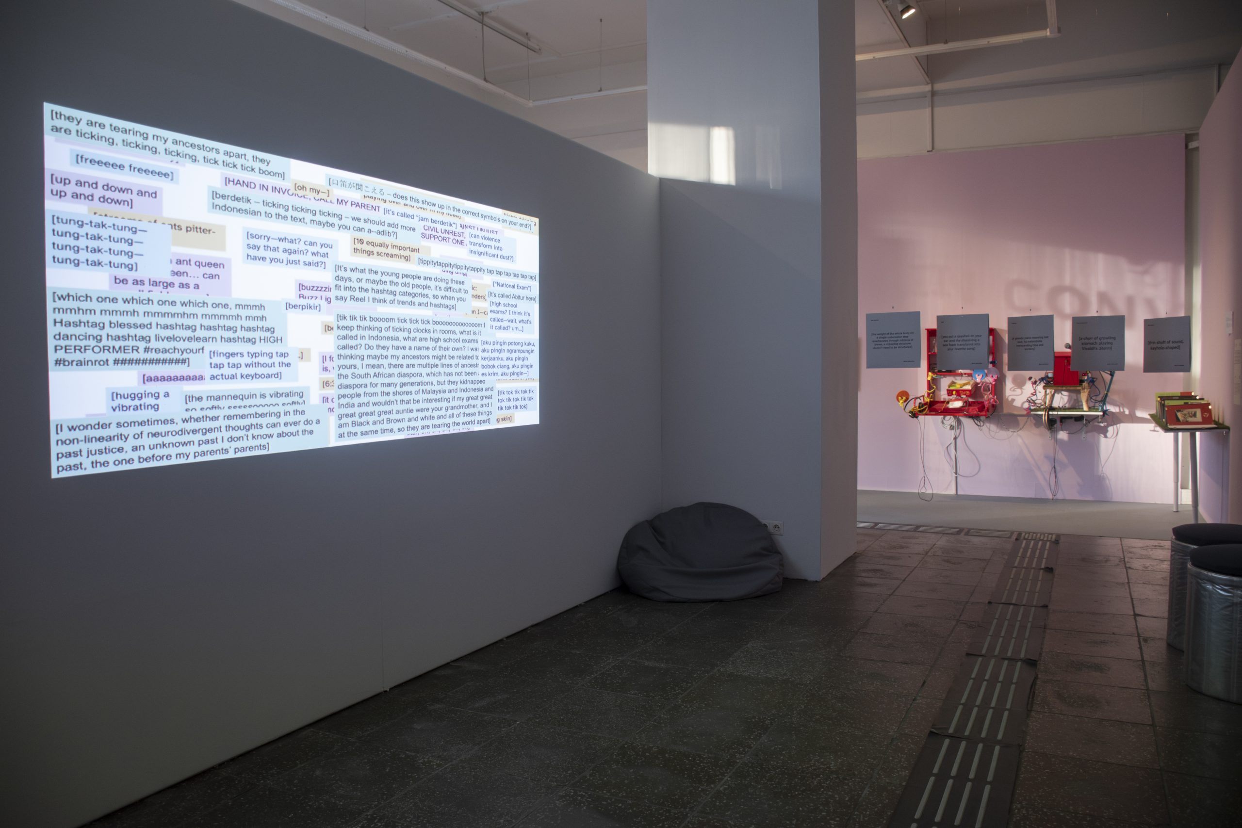 Die gezeigten Arbeiten umfassen Kurzfilme, Installationen, interaktive Spiele, sowie Live-Performances. Sie bilden ein Geflecht aus akustischen, visuellen, taktilen und psychologischen Erfahrungen und sind aus einem gemeinschaftlich kreativen Prozess hervorgegangen. Ausschlaggebend dabei war das Konzept der Crip Time. Hierbei entwickeln sich Arbeiten organisch – langsam, aber stetig wachsen sie – wie Pflanzen im Rhythmus biologischer Zeit. In diesem Kontext wird die kollektive Intelligenz zum Ausgangspunkt der Kreativität und der Kunstschaffende wandelt sich zu einer achtsamen Mediationsperson des gemeinsamen Gestaltungsprozess.