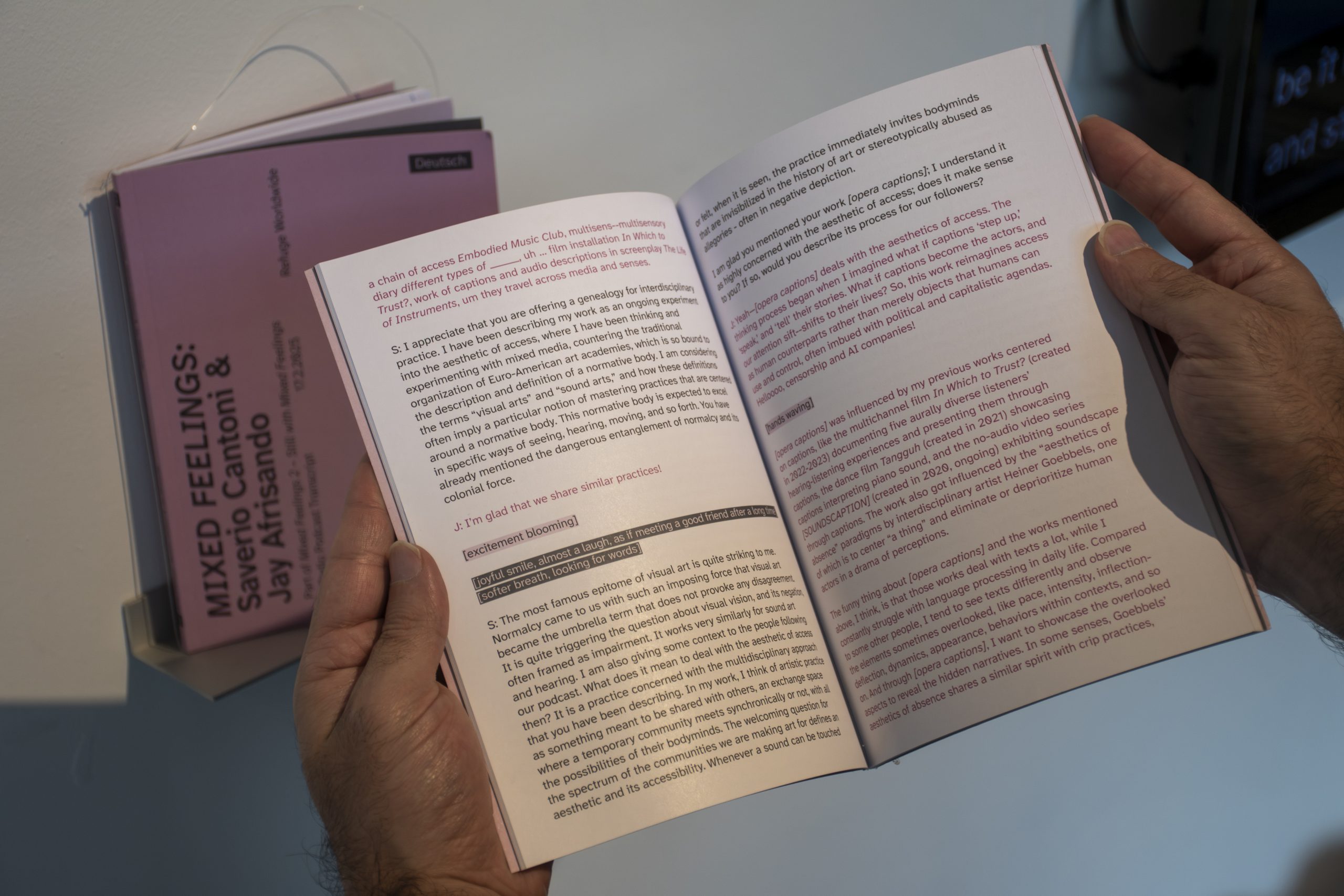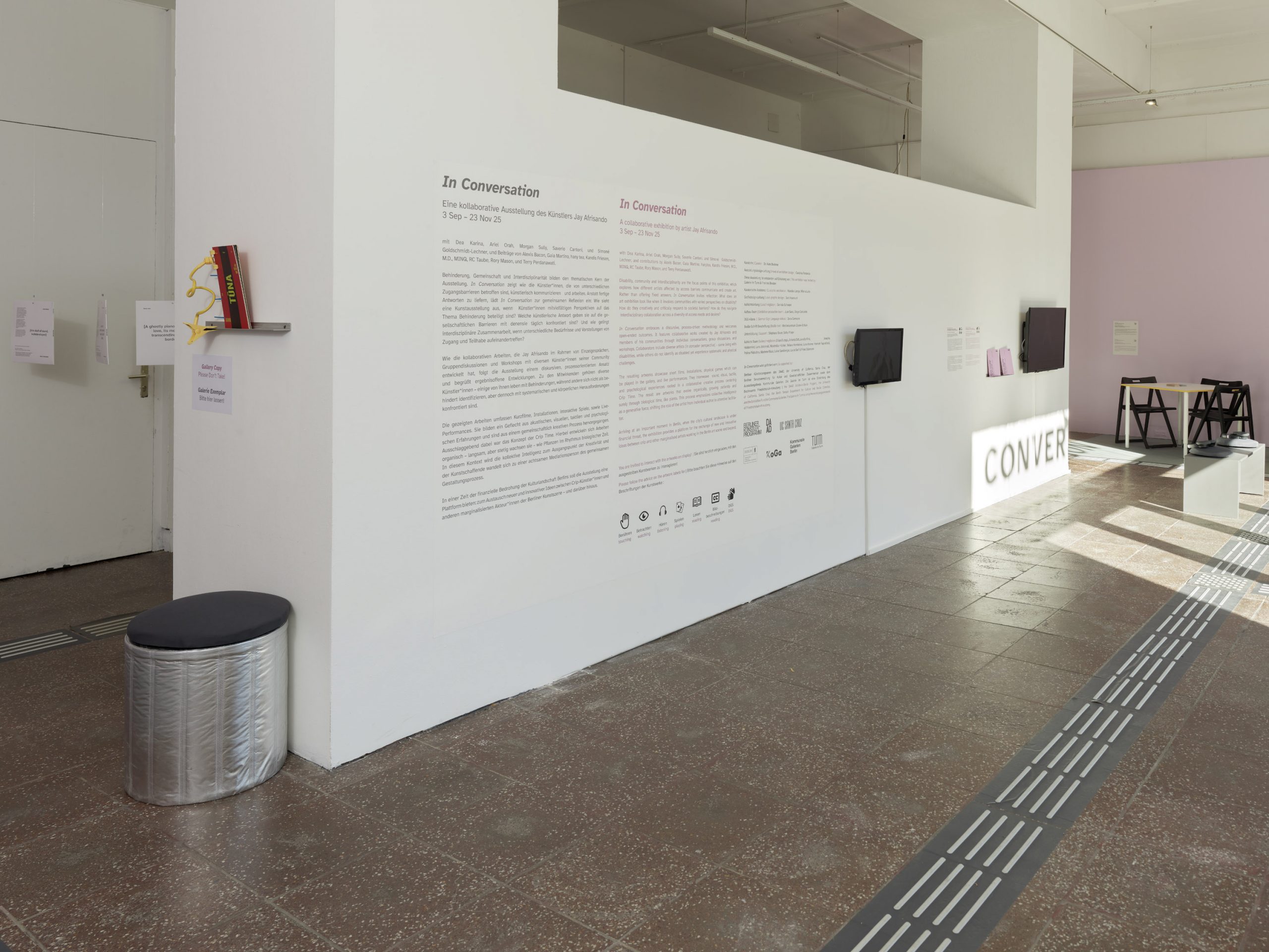 Anstatt fertige Antworten zu liefern, lädt In Conversation zur gemeinsamen Reflexion ein: Wie sieht eine Kunstausstellung aus, wenn Künstler*innen mit vielfältigen Perspektiven auf das Thema Behinderung beteiligt sind? Welche künstlerische Antwort geben sie auf die gesellschaftlichen Barrieren mit denen sie täglich konfrontiert sind? Und wie gelingt interdisziplinäre Zusammenarbeit, wenn unterschiedliche Bedürfnisse und Vorstellungen von Zugang und Teilhabe aufeinandertreffen?